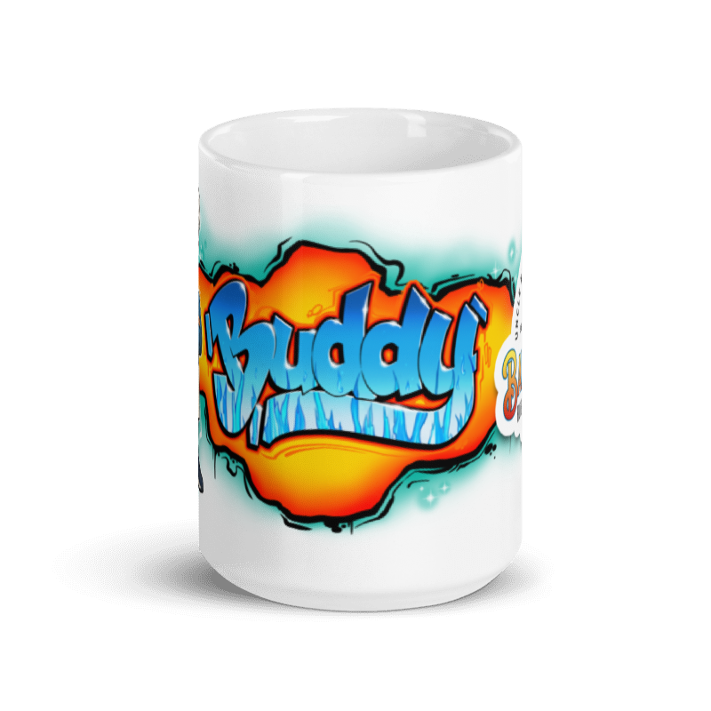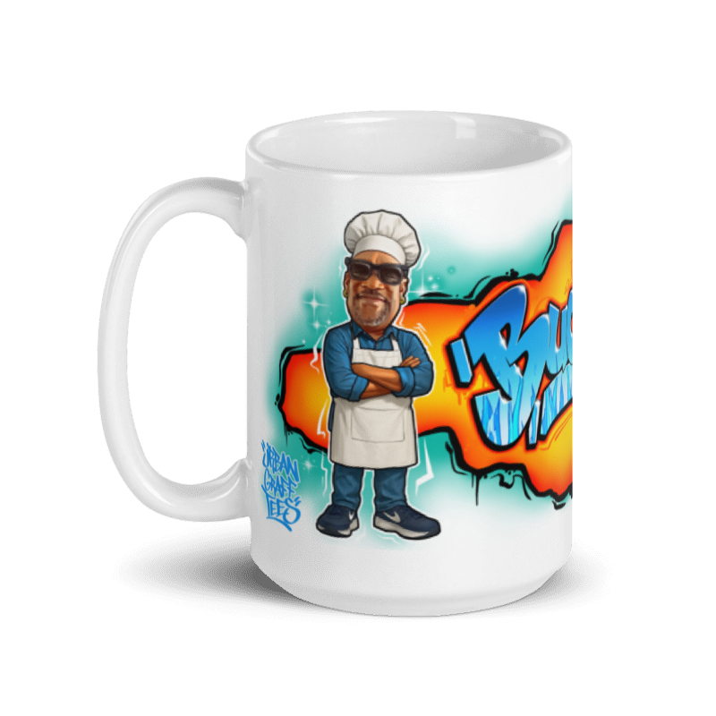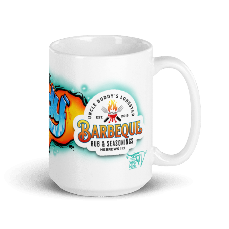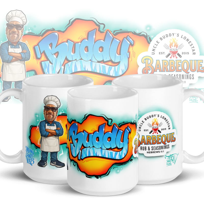 Imagine that, a graffiti mug that features a character of yourself on one side and your logo on the other! Uncle Buddy’s LoneStar BBQ makes delicious rub and sauce with that infamous Texas kick! Whether you’re drinking your morning coffee, evening tea, or something in between, this mug keeps your ritual looking fresh. The graffiti artwork is printed crisp and bold so it can stand up to daily use.